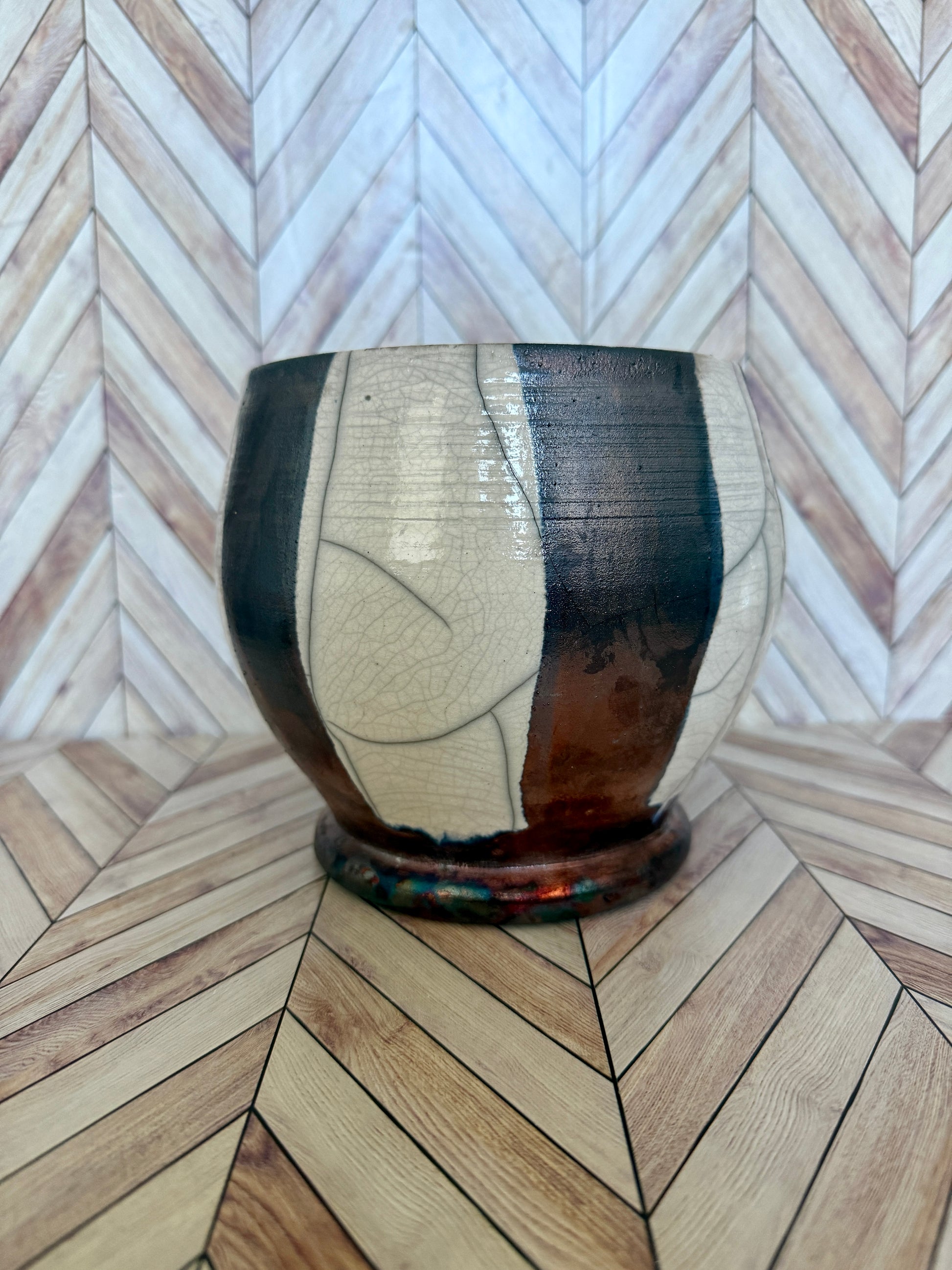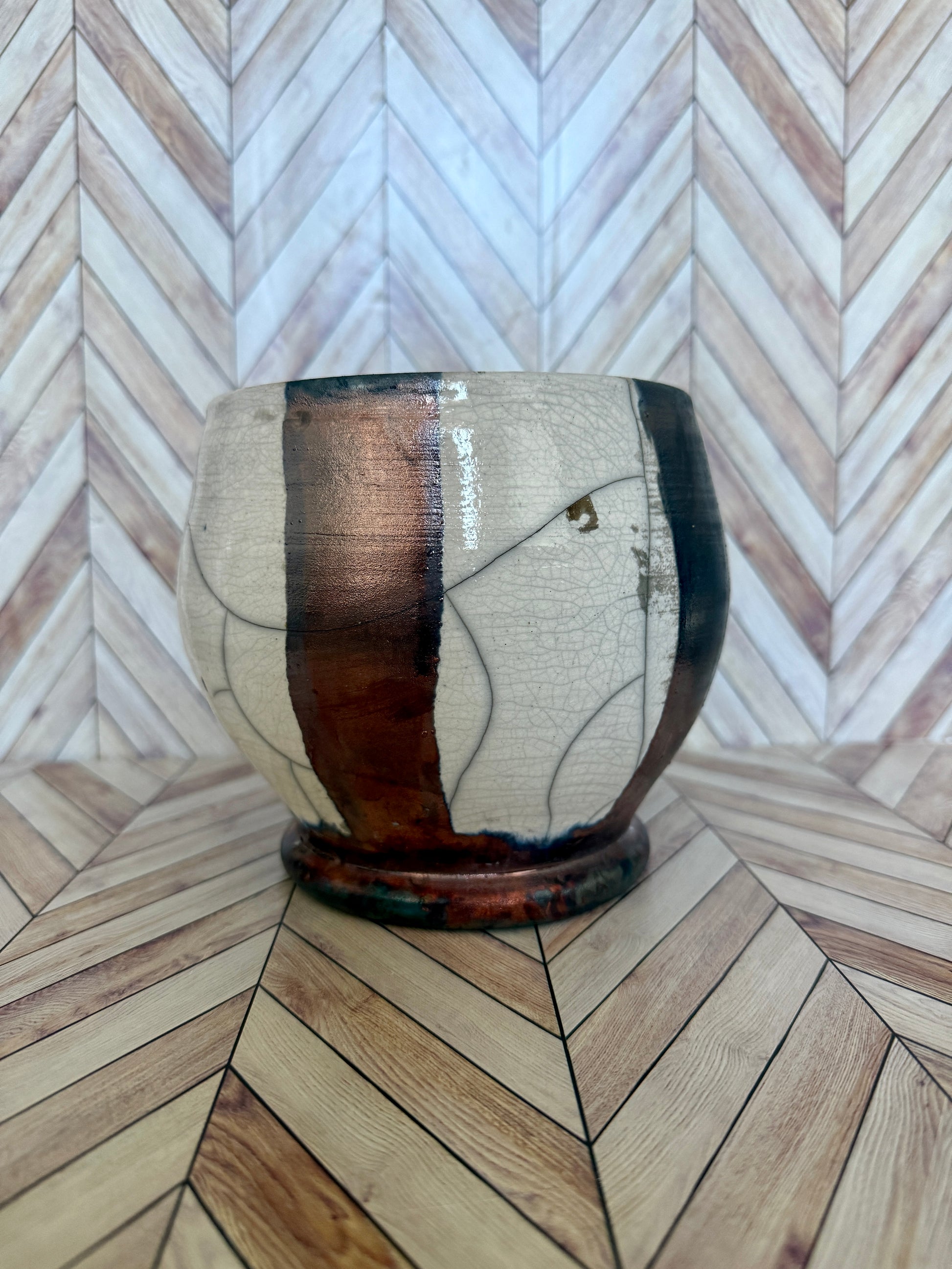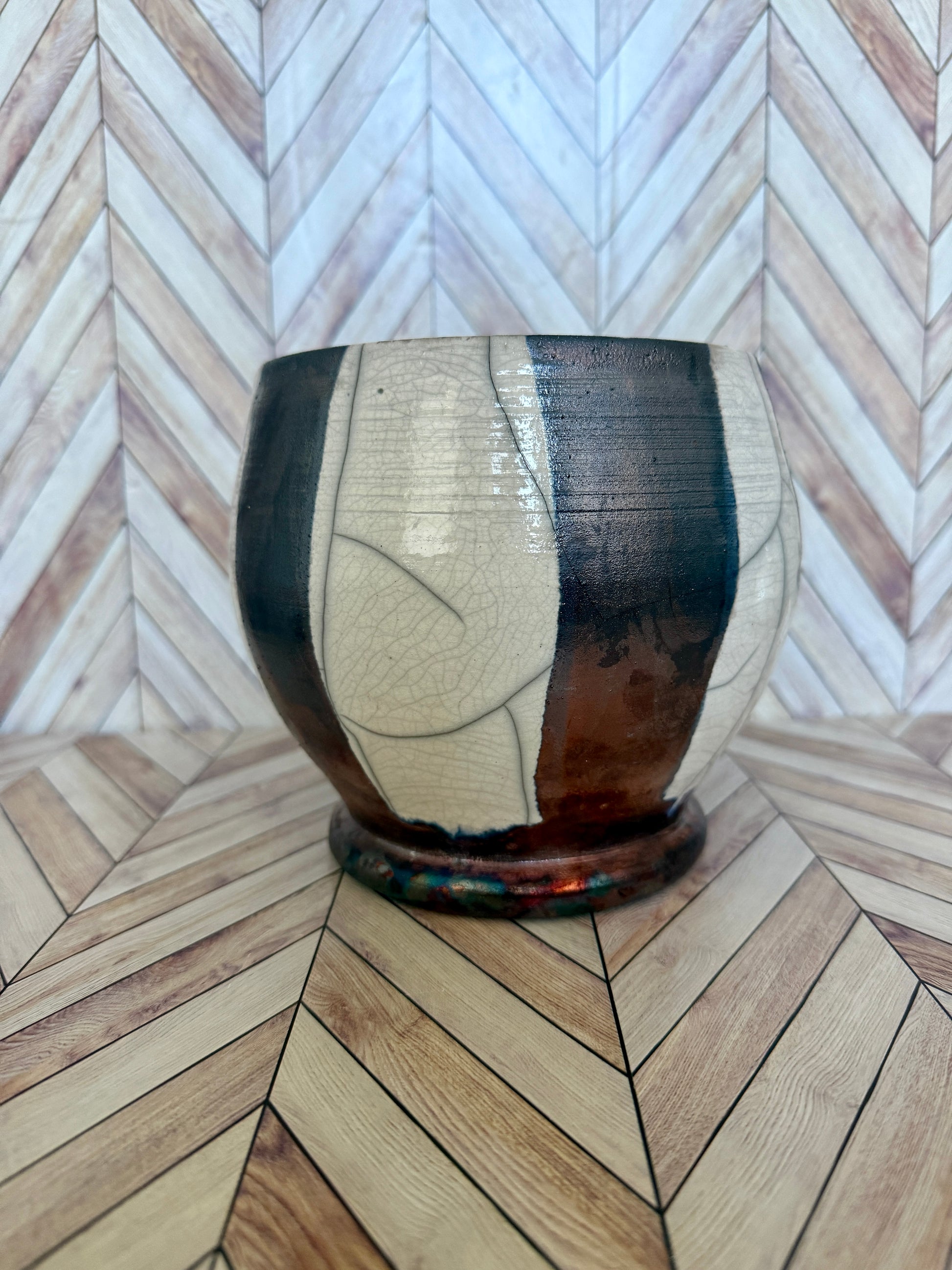 Make a bold statement with Bea 101, a handcrafted raku ceramic piece. Perfect as a decorative bookshelf accent or planter bowl, this unique creation adds artistry and flair to any space.
