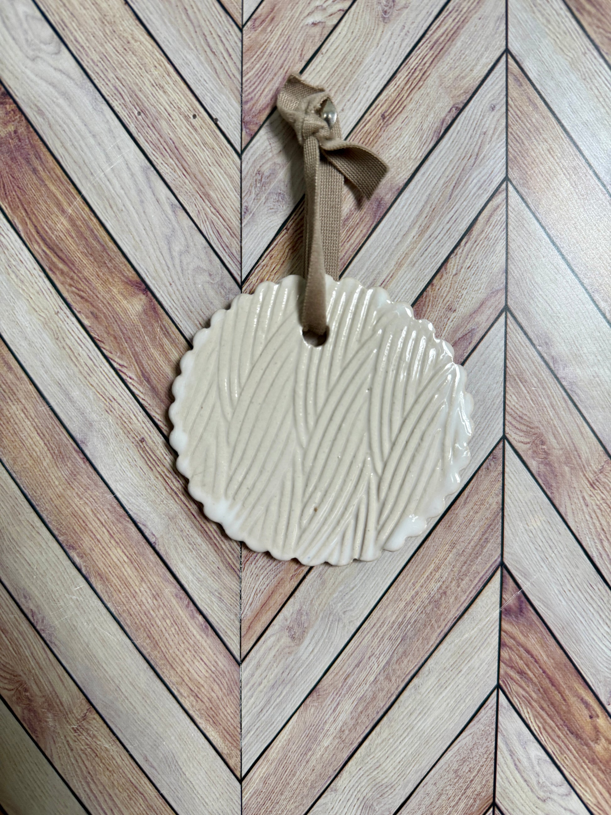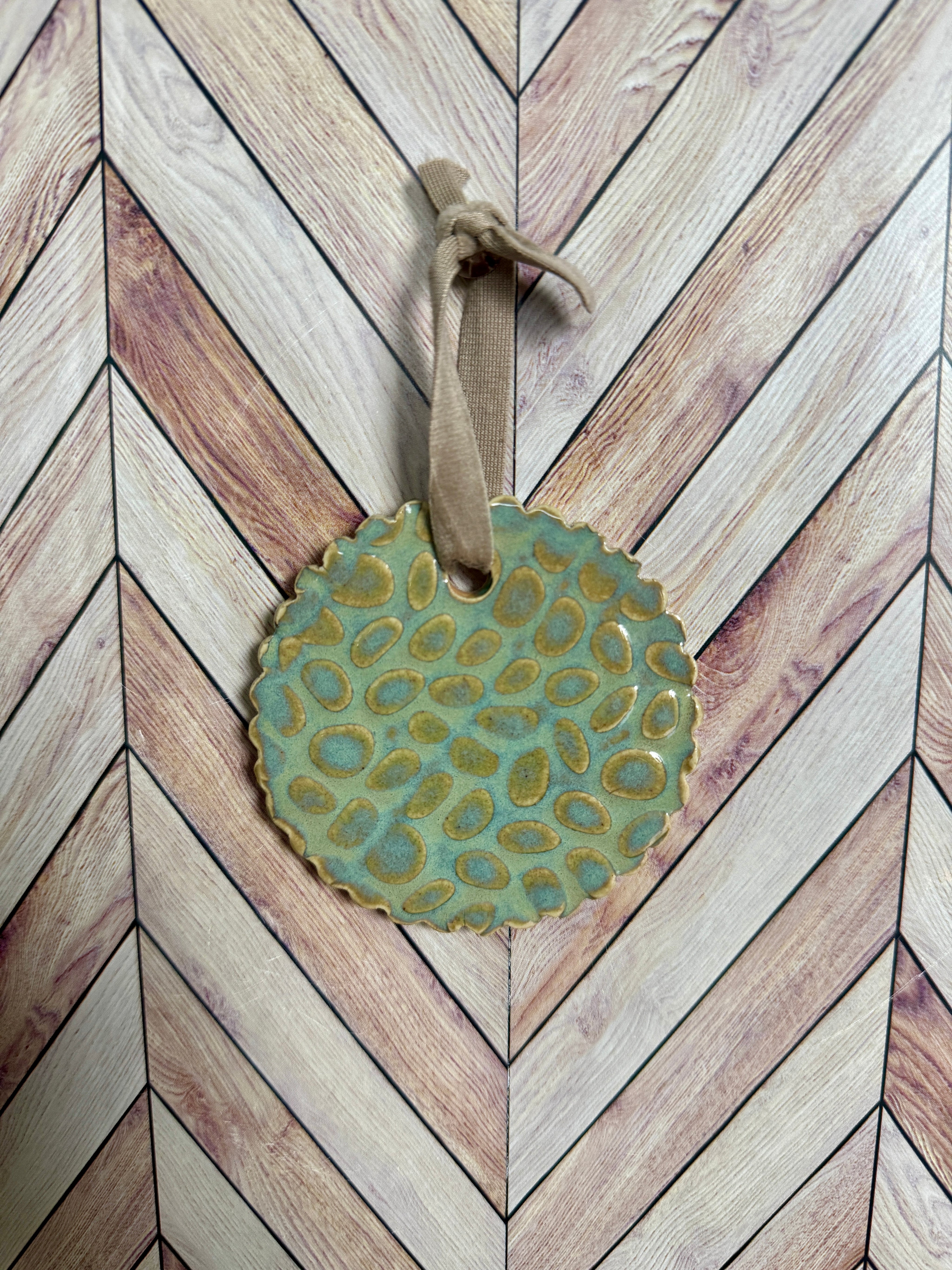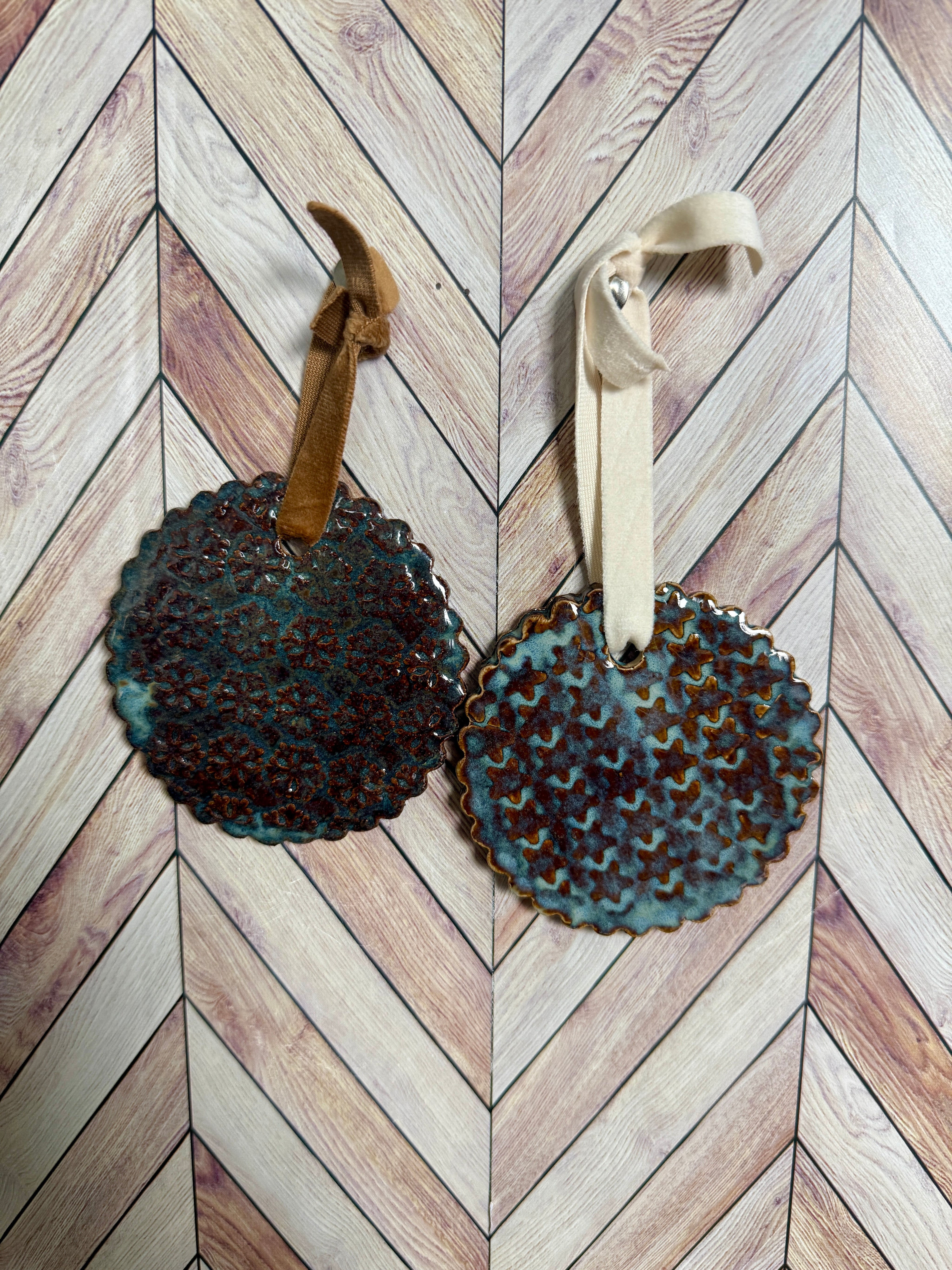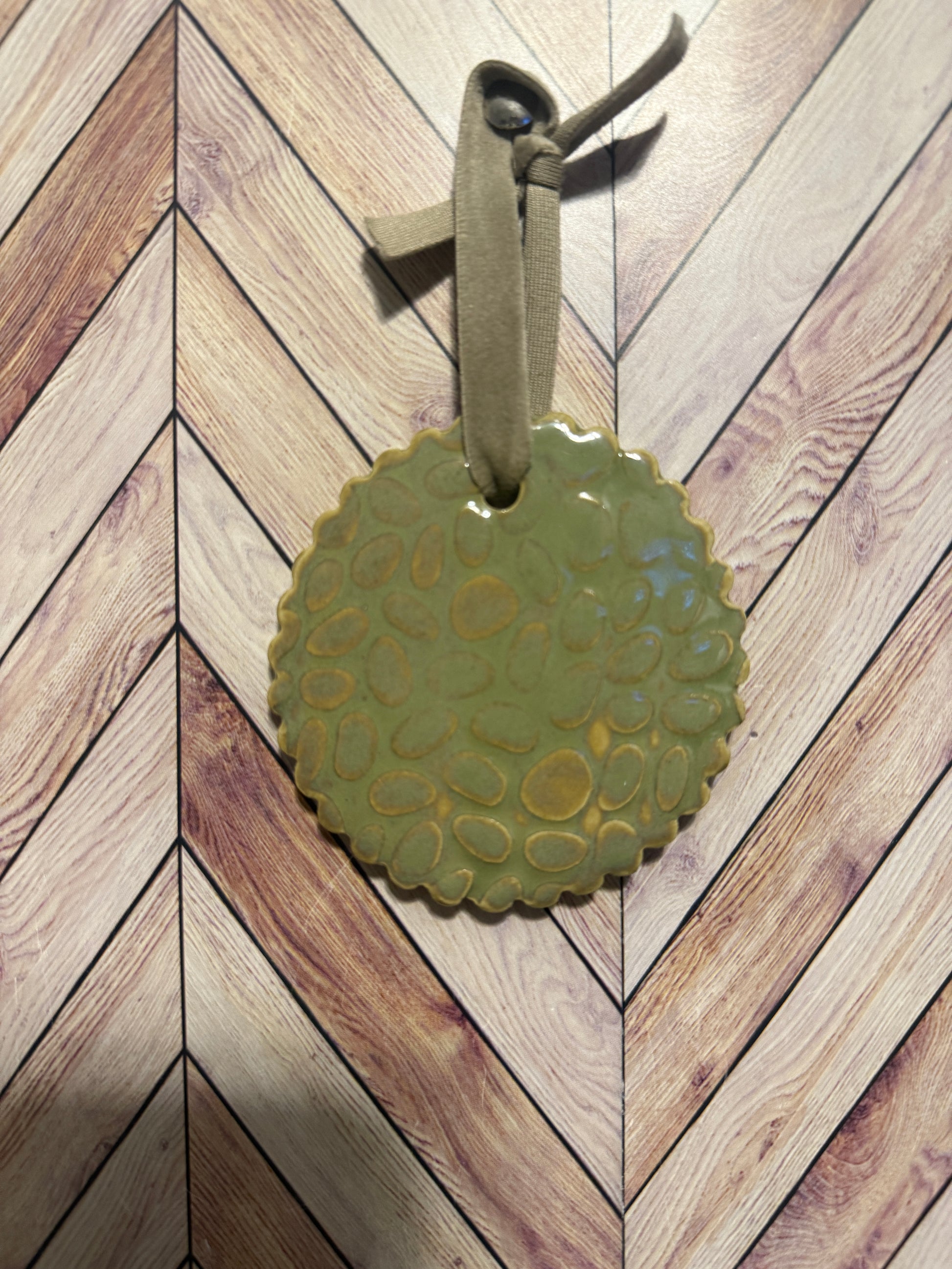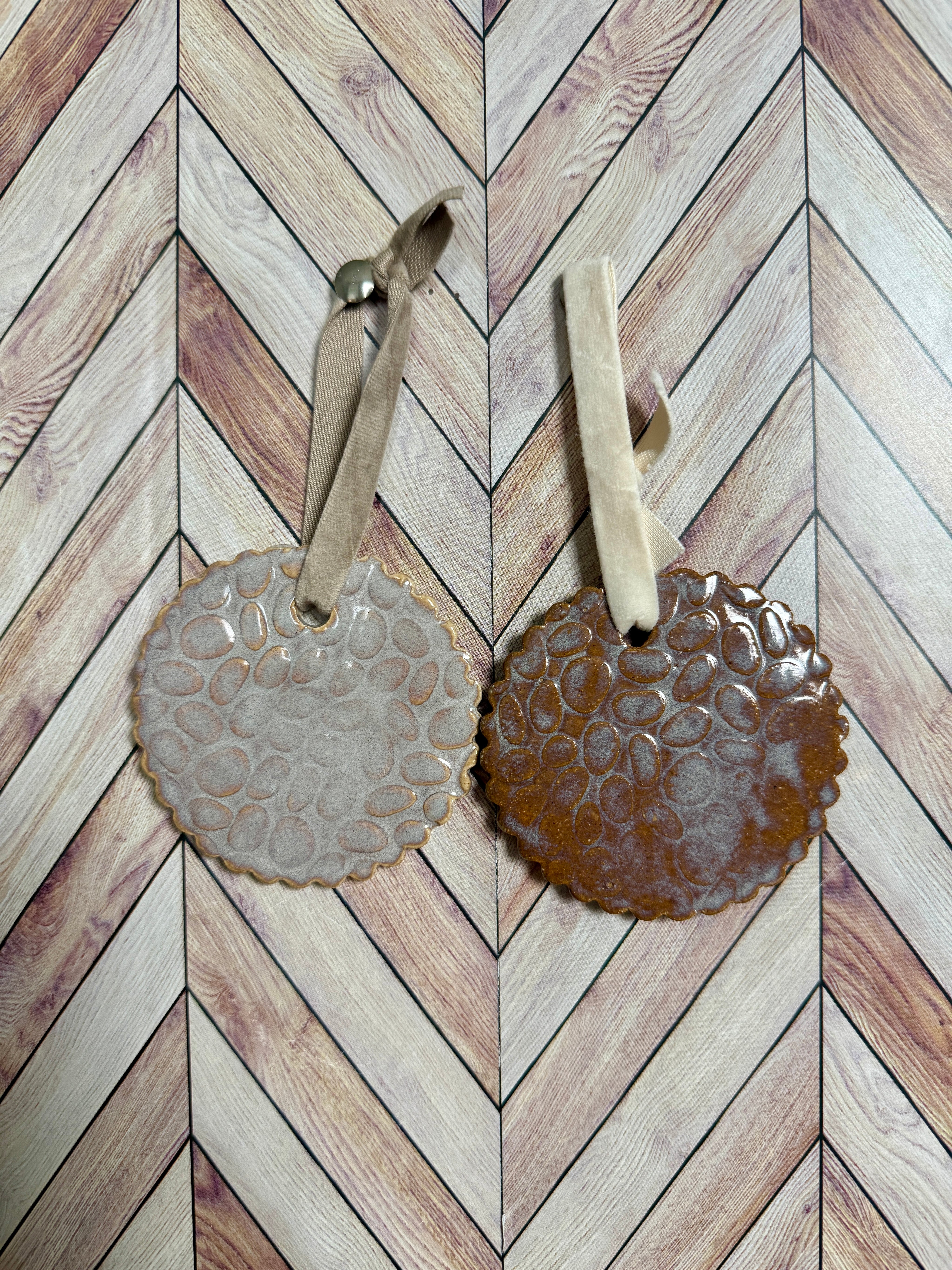 Ornament texture and ribbon color vary by piece. If you’d like a specific combination of ornament shape, color, texture and/or ribbon color, please submit a request using the custom request form.