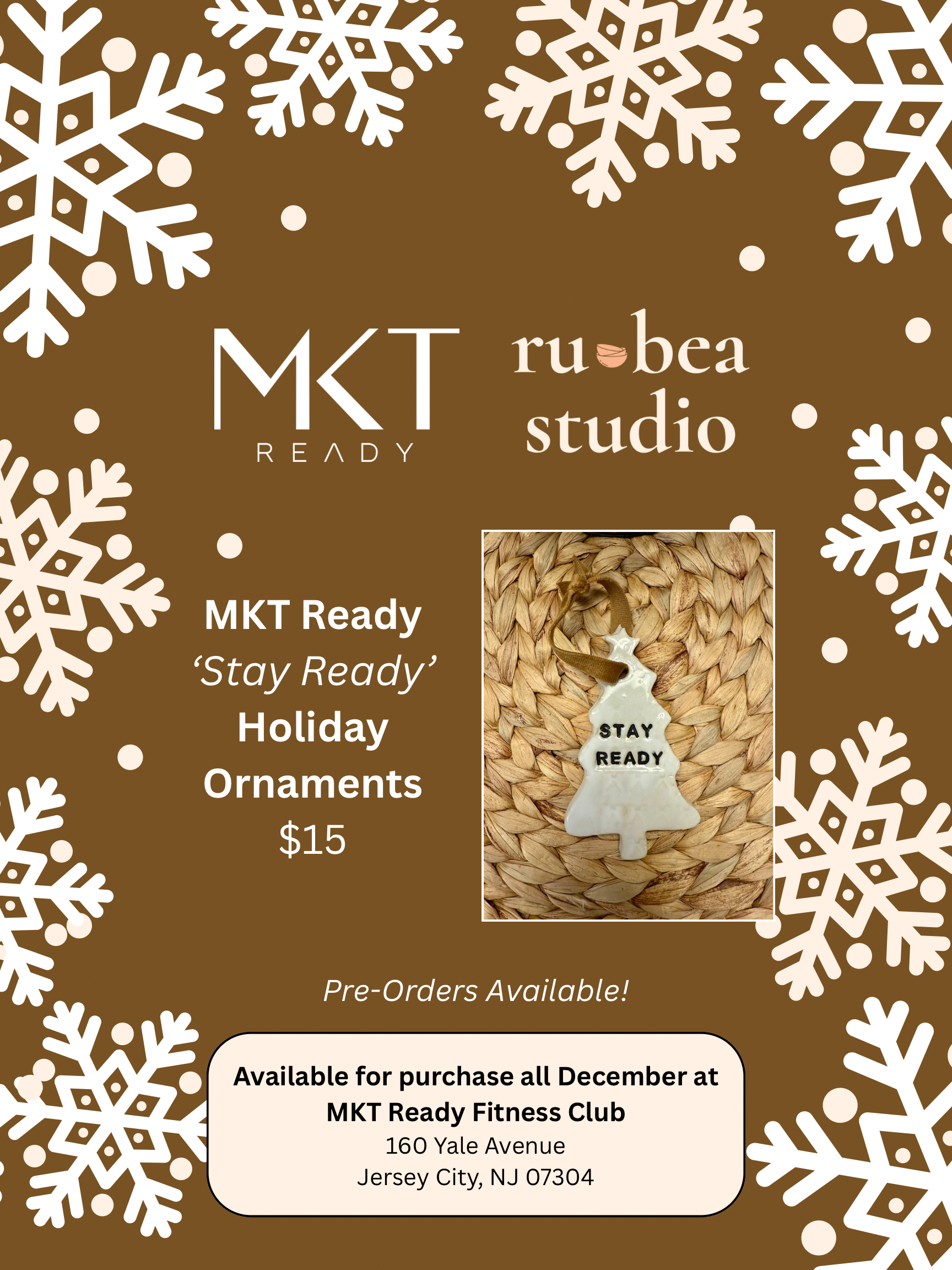 We are excited to partner this holiday season with MKT Ready, a fitness studio based in Westside Jersey City, NJ, to share MKT Ready holiday ornaments!! Pre-order now and your ornament will be available for purchase in person starting in December!! On your order, please select the Local Pickup option, and your order will be delivered to the studio! Ornaments are not available for shipping during pre-orders.